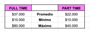 • El sueldo promedio de quienes trabajan FULL TIME es de $37.000, y va desde $10.000 de mínimo a $80.000 máximo