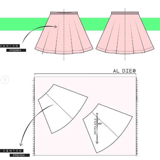 • AL BIES: El molde se ubica a 45 grados. Es más común en faldas y vestidos ya que se adapta mejor al cuerpo y genera más movimiento.